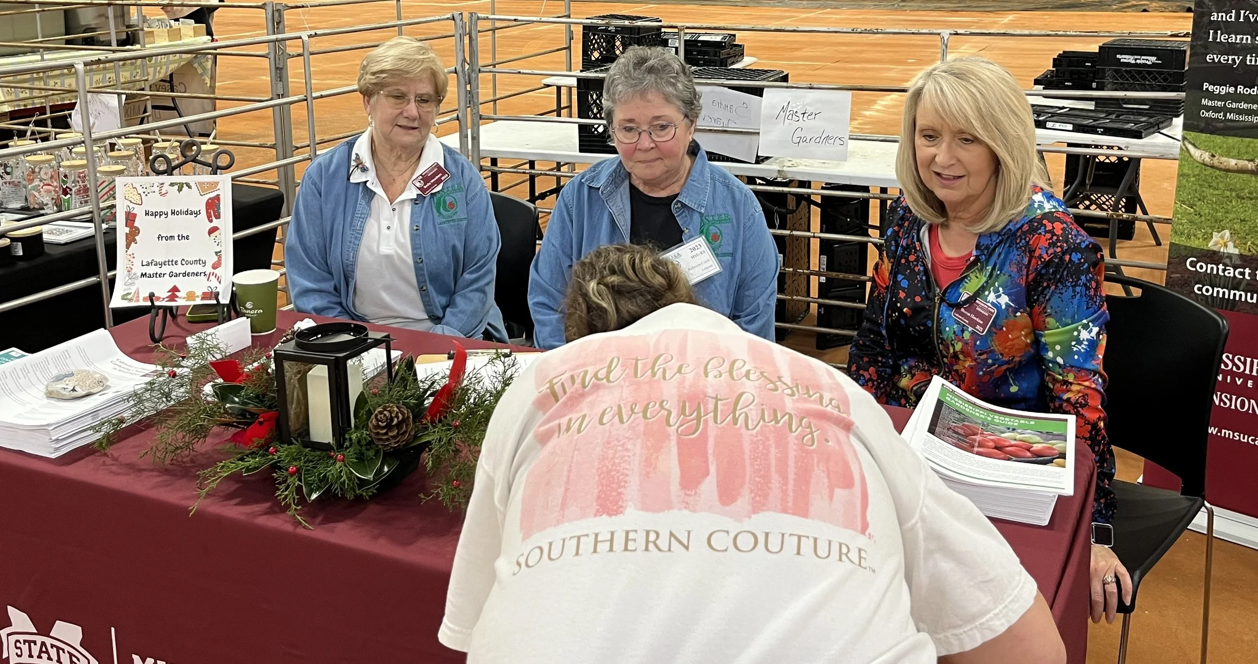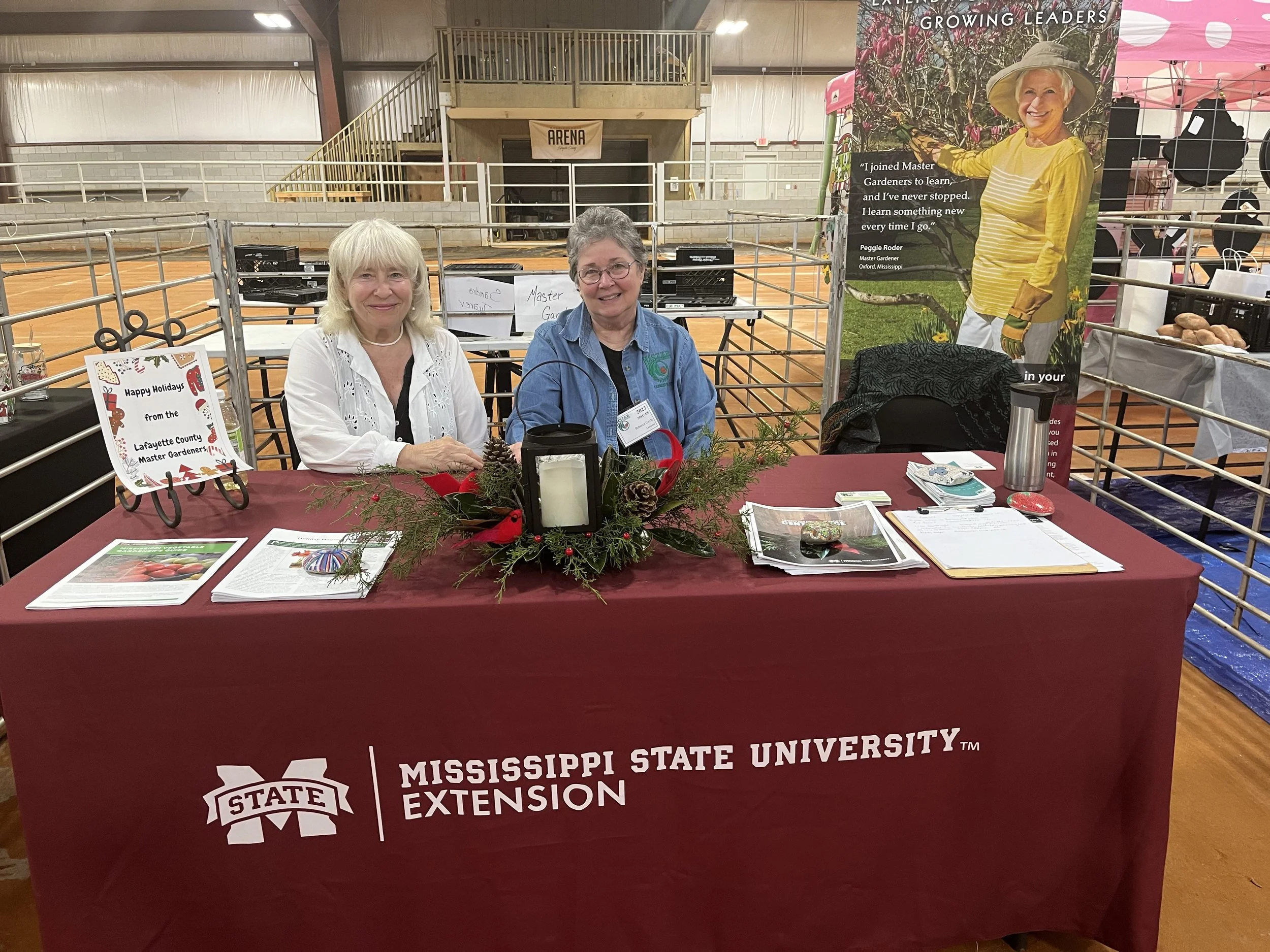 The Lafayette County Master Gardeners spent the weekend sharing their garden knowledge with participants at the Holiday House Arts & Crafts Fair in the Arena and at the Chamber of Commerce Holiday Open House on the Square. 15 Master Gardeners volunteered 16 hours of their time for these two events and provided assistance to the citizens of Lafayette County. Gift baskets were provided for both events.